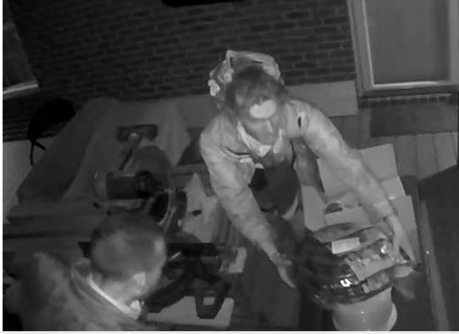 The two men, both white, were seen in home surveillance video rummaging around the homeowners back porch at 5 a.m. Renovations were underway at the residence. The men took two large spools of cable and conduit hose.