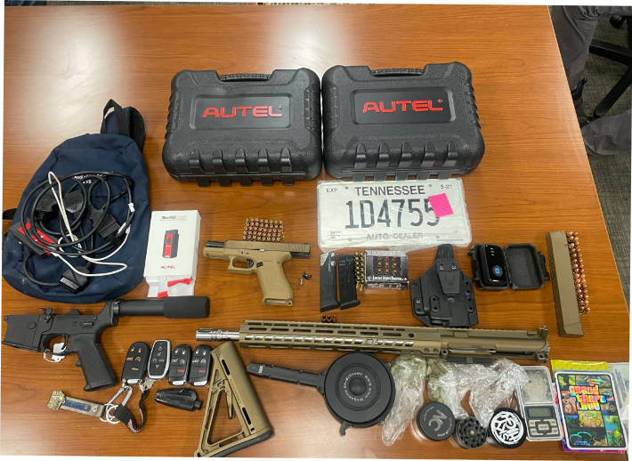 The Lexus he had been driving had been reported stolen in Murfreesboro. The pistol was recovered from the front seat. A red Nissan Maxima parked in the driveway was also reported stolen. Recovered from the residence was a second AR-15 lower receiver that had been reported stolen from a Knoxville gun show. Detectives also recovered programmable key fobs, a Dodge key fob, a Tennessee dealer tag, 21 grams of marijuana and drug paraphernalia.