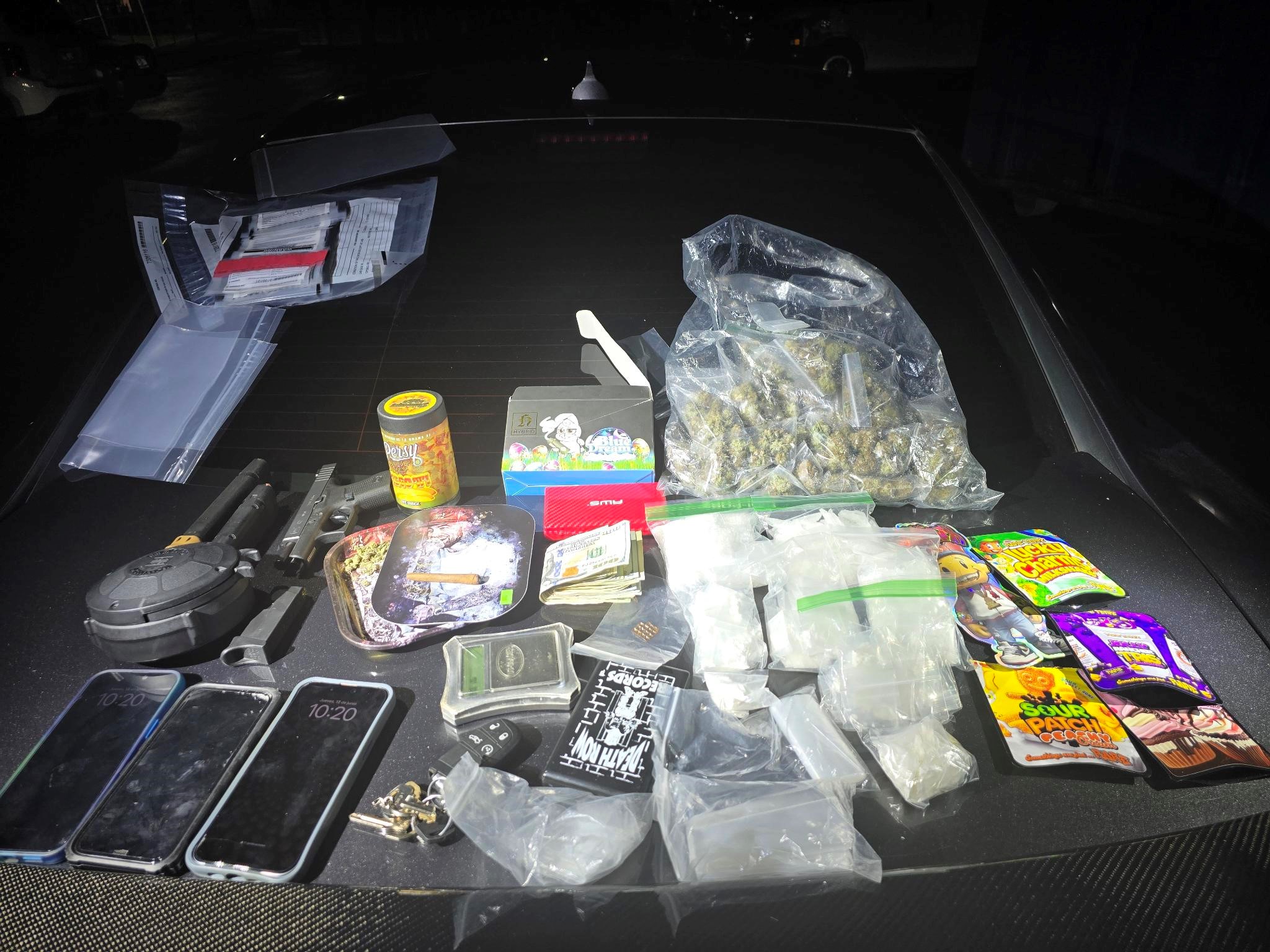 In addition to the backpack found in Hernandez' flight path, a second backpack was recovered from the Dodge Charger. Both backpacks contained narcotics and paraphernalia including 337.2 grams of meth, 662.8 grams of marijuana, THC products, three digital scales, and plastic baggies. A Glock .380 handgun, reported stolen during a motor vehicle burglary in Williamson County, was also recovered from the car.